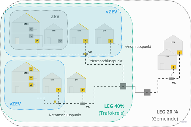 Anders als bei einem Zusammenschluss zum Eigenverbrauch (vZEV) bleiben die einzelnen Teilnehmenden einer LEG Kundinnen und Kunden der Elektra. Die Teilnehmenden einer LEG haften für ihren individuellen Energiebezug und nicht solidarisch gegenüber der Elektra. Zudem ist die räumliche Ausdehnung bei einer LEG bis zur Gemeindegrenze und bei einem vZEV nur bis zum ersten gemeinsamen Netzverknüpfungspunkt.