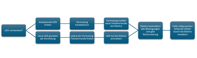 Zur Anmeldung einer LEG benötigt die Elektra vollständig ausgefüllte Unterlagen, unterzeichnete Teilnahmebestätigungen aller Beteiligten. Erst wenn sämtliche Unterlagen vollständig vorliegen, beginnt die gesetzliche Frist für die Prüfung. Diese umfasst die Überprüfung der technischen Voraussetzungen (Netztopologie, PV-Anteil und Installation der Smart Meter). Fehlende Smart Meter werden durch die Elektra installiert. Sobald alle Voraussetzungen erfüllt sind, bestätigt die Elektra den Start der LEG. Dieser erfolgt in der Regel auf den nächsten Quartalsbeginn ausser, es wird ausdrücklich ein Start auf ein späteres Quartal gewünscht. Parteien, bei denen der Smart Meter noch installiert werden muss, werden auf den Folgemonat in die LEG aufgenommen. Die Abrechnung wird ab Quartalsbeginn als LEG vorgenommen. Verzögerungen, etwa durch bauliche Gegebenheiten wie asbesthaltige Installationen, werden der Vertretung gemeldet. Eine Aufnahme dieser Partei ist erst nach erfolgreicher Installation des Smart Meters möglich.
